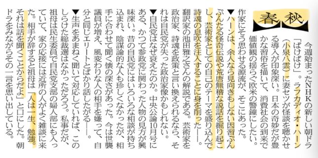 This article mentions that Lafcadio Hearn is highlighted in connection with NHK’s new morning drama “Bakebake.” He unearthed Japanese ghost stories and customs, portraying them from a Western perspective, and his works are said to foreshadow the arrival of consumer society. Translator Masayuki Ikeda likened Hearn’s efforts to those of a politician who sacrifices himself for policies, emphasizing his dedication to contributing both to art and to society.