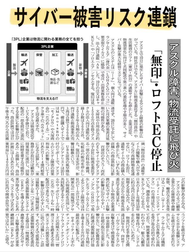 According to the article, a cyberattack on major e-commerce logistics company Askul on the 19th disrupted operations for online stores of Muji and Loft, for which Askul handled logistics. The company’s “LOHACO” system went down, halting shipping and inventory management. The impact reportedly extended to partner companies, raising concerns about a chain reaction of damages spreading through third-party logistics (3PL) networks.
