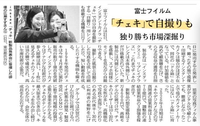 According to the article, Fujifilm will release a new model of its instant camera “Cheki” in November, equipped with a lens designed for selfies. Since its debut in 1998, the Cheki has sold over 100 million units worldwide and remains especially popular among young women. Even in the smartphone era, the joy of instantly printed photos continues to attract users, and Fujifilm reportedly aims to further expand its market by adding features such as short video creation.