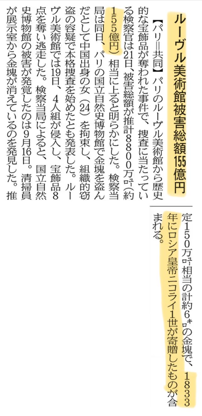この記事によると、パリのルーヴル美術館で盗難事件が発生し、被害総額は約155億円にのぼるとのことです。盗まれた中には1833年にロシア皇帝ニコライ1世が寄贈した金塊も含まれているそうです。フランス当局は、中国出身の容疑者を拘束し、組織的な犯行の疑いで捜査を進めていると伝えられています。